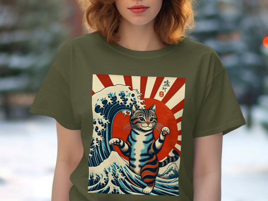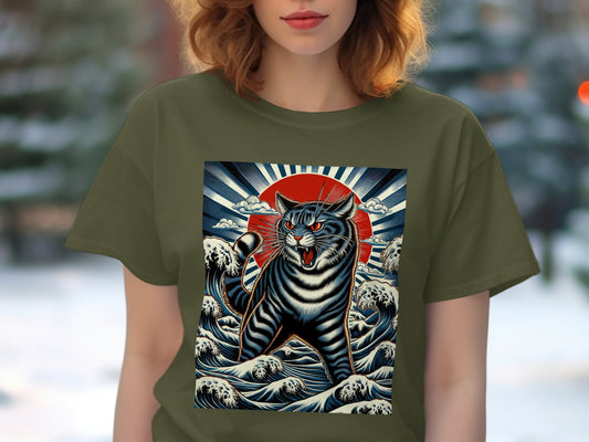 Fierce Japanese Sun Great Wave Cat Graphic T-Shirt