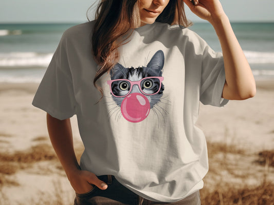 Funny Cat with Pink Glasses and Bubblegum T-Shirt