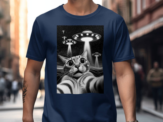 Funny Cat Selfie with UFOs Graphic Print T-Shirt